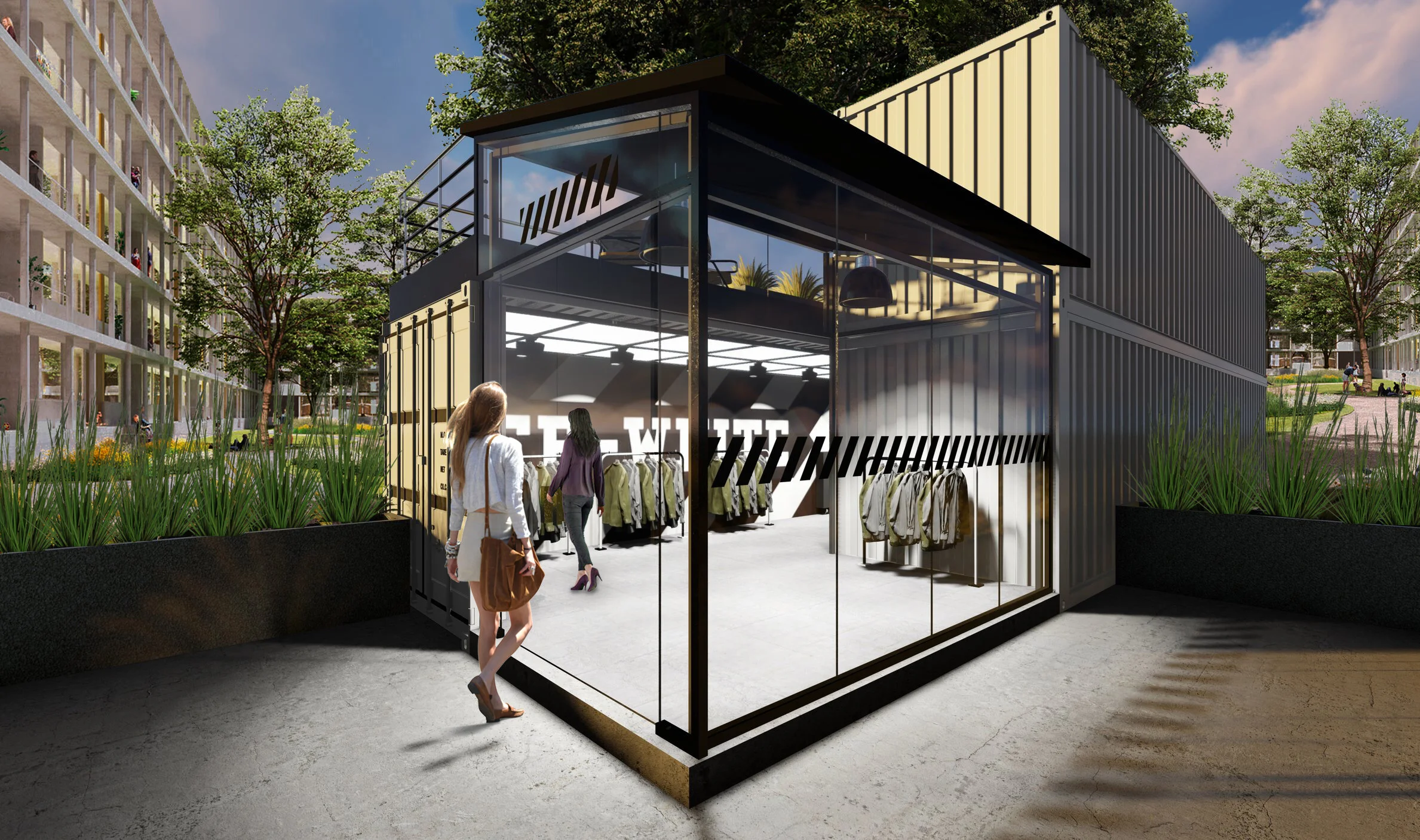 ensuring off white stay ahead of the trend with eco pop up opportunities we have designed this modern unique shop, entire structure created using recycled shipping containers which are easy to source and quick to adapt.